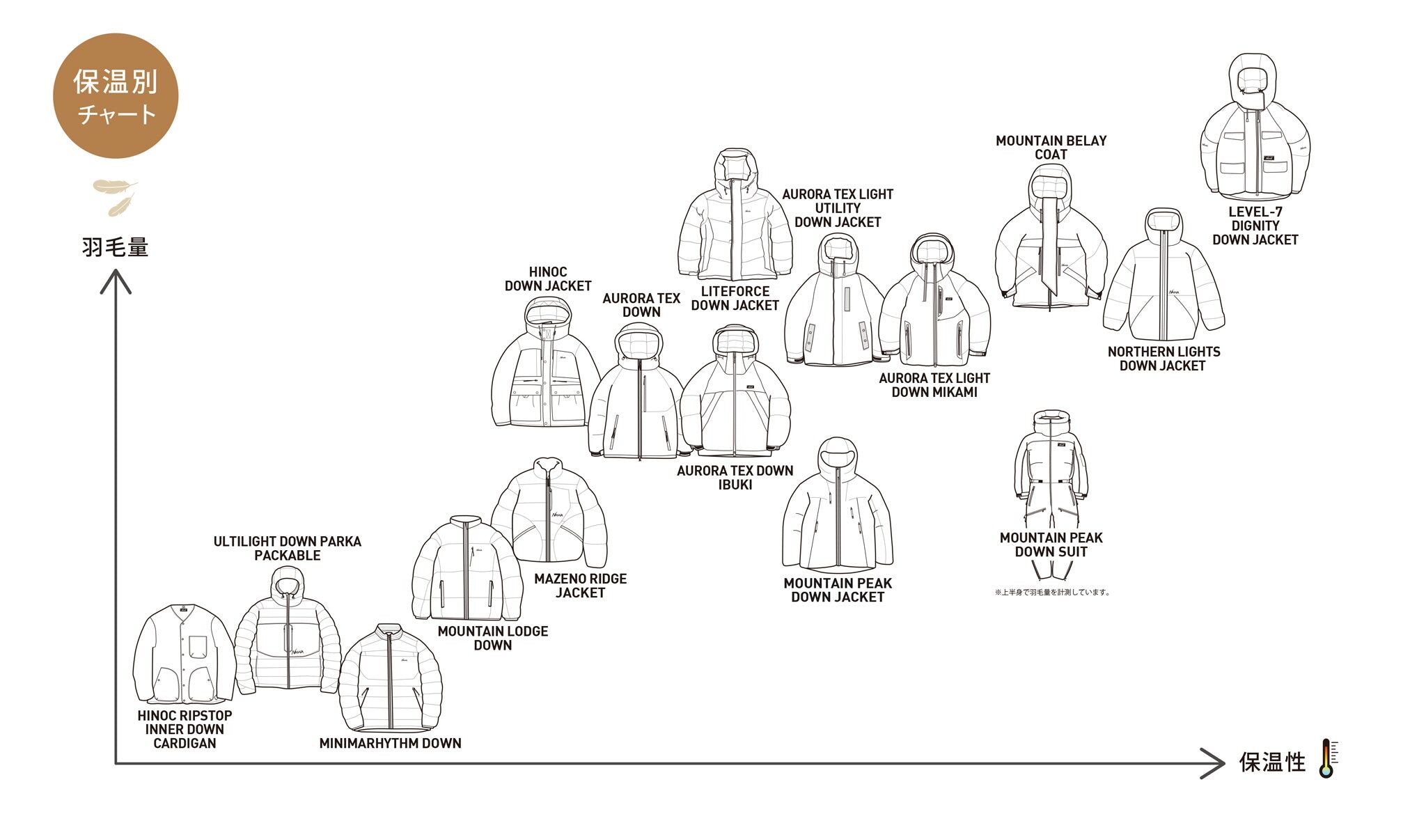 ▸ 縱軸代表羽絨填充量,橫軸代表保暖性能。根據保暖性能對 NANGA 的主要羽絨外套進行了分類整理。