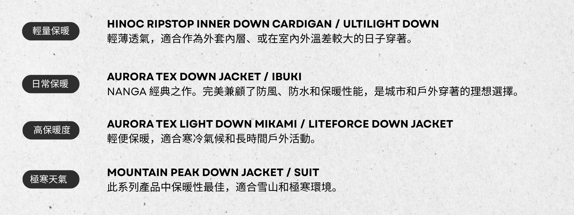 NANGA 提供具有不同保暖性能和用途的產品,從城市日常使用到山上的戶外活動。