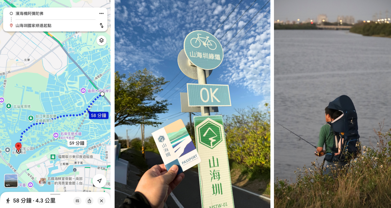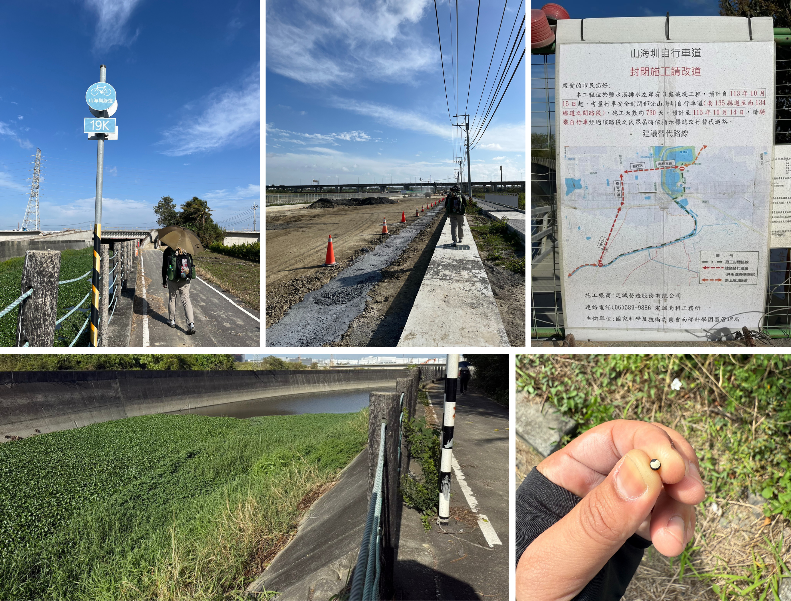 最終為了不摸黑夜行,只好使用鈔能力,隨手攔了趟小黃,接送我們到 0km 起點。不過連小黃運將都不知道原來出海口河堤有道路可以進到堤防尾端,看來我們也替運將解鎖了新成就。也驗證了抵達 0km起點的方法,真是傳說中的不解之謎。官方並沒有完整的配套措施和規劃,甚至相關機關單位的也未見能一致的說法,完善程度稍微可惜一些。不過對於騎單車遊玩內海之路的旅客來說,除了同向進出需要白騎一段之外,相較於徒步者比較不會感到不便。