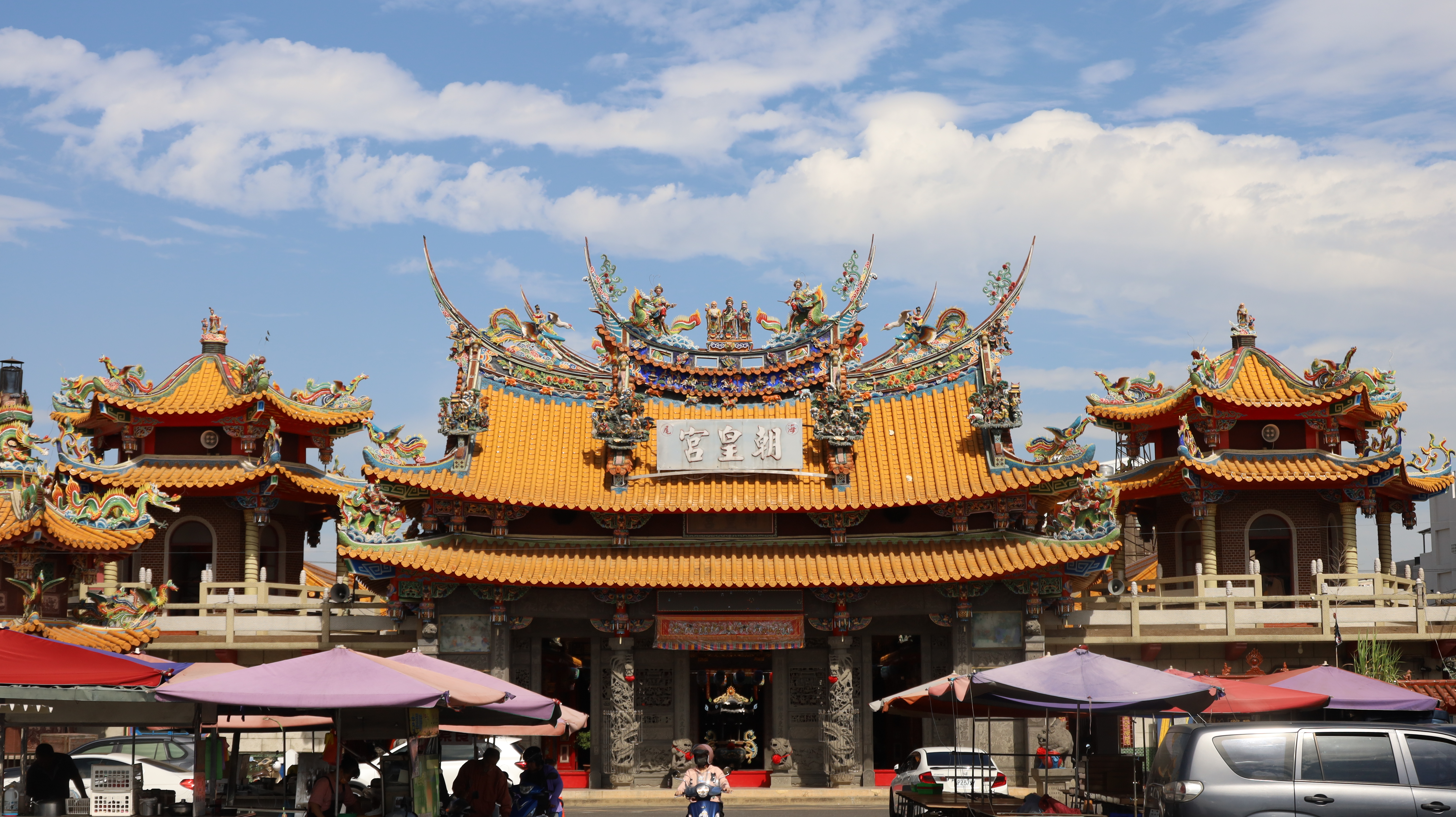 吃飽後前往第二集章處 ─ 海尾朝皇宮。朝皇宮興建於光緒四年(西元1878年),是清末開放渡台後很重要的漢人信仰中心,主祀保生大帝,相傳當年海尾地區瘟疫肆虐,先民吳氏等人建廟請神祈祀。(保生大帝為閩南信仰中所信奉的醫神)