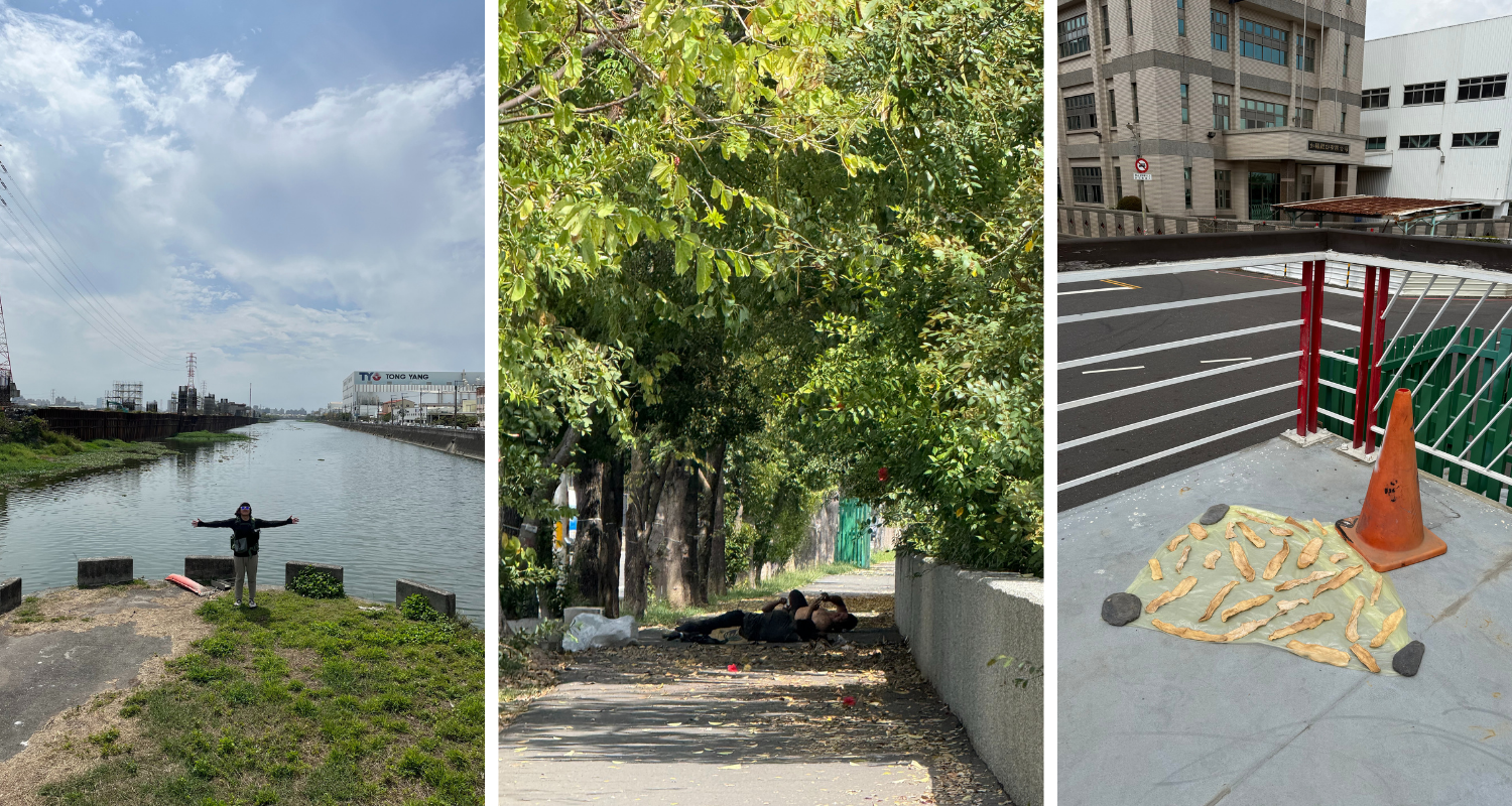 沿水圳前行,路上見工人席地而躺休息、居民在人行道曬蘿蔔,生活步調那是清幽又慢活。