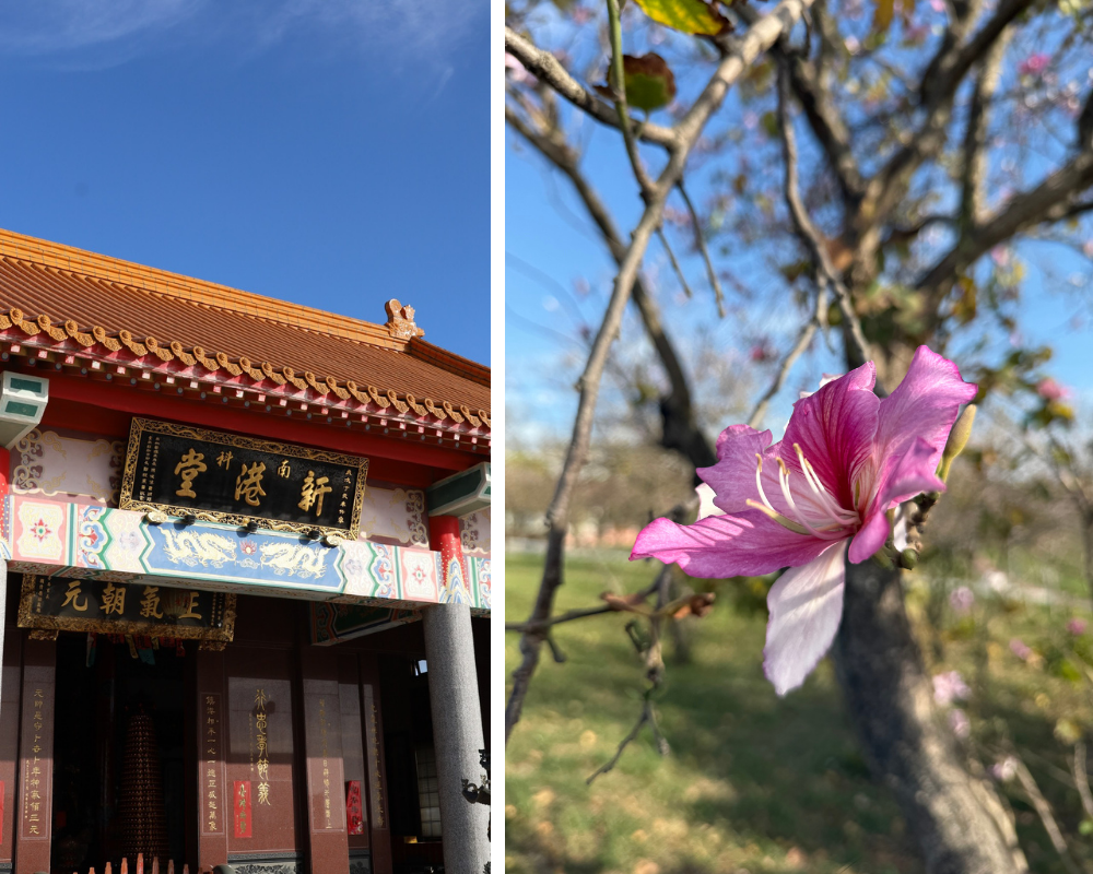 ▸ 經過新港社地方文化館,湖邊正是一圈盛開的羊蹄甲花,順訪新港堂,借個廁所小休再續行