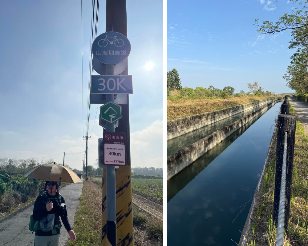 接續 30K 里程牌後,沿著一段有分隔牆的嘉南大圳續行,經過其灌溉愛文、金煌芒果田,整路是有機肥傳來的陣陣悶騷臭味,果農的工作真是非常辛苦。已不記得為何會和路上的果農大哥聊了起來,大哥很熱情向我們講解如何透過不同葉形來分辨各種品種的芒果,甚至邀請 6- 7月採收期再來訪,他要請我們吃芒果。
