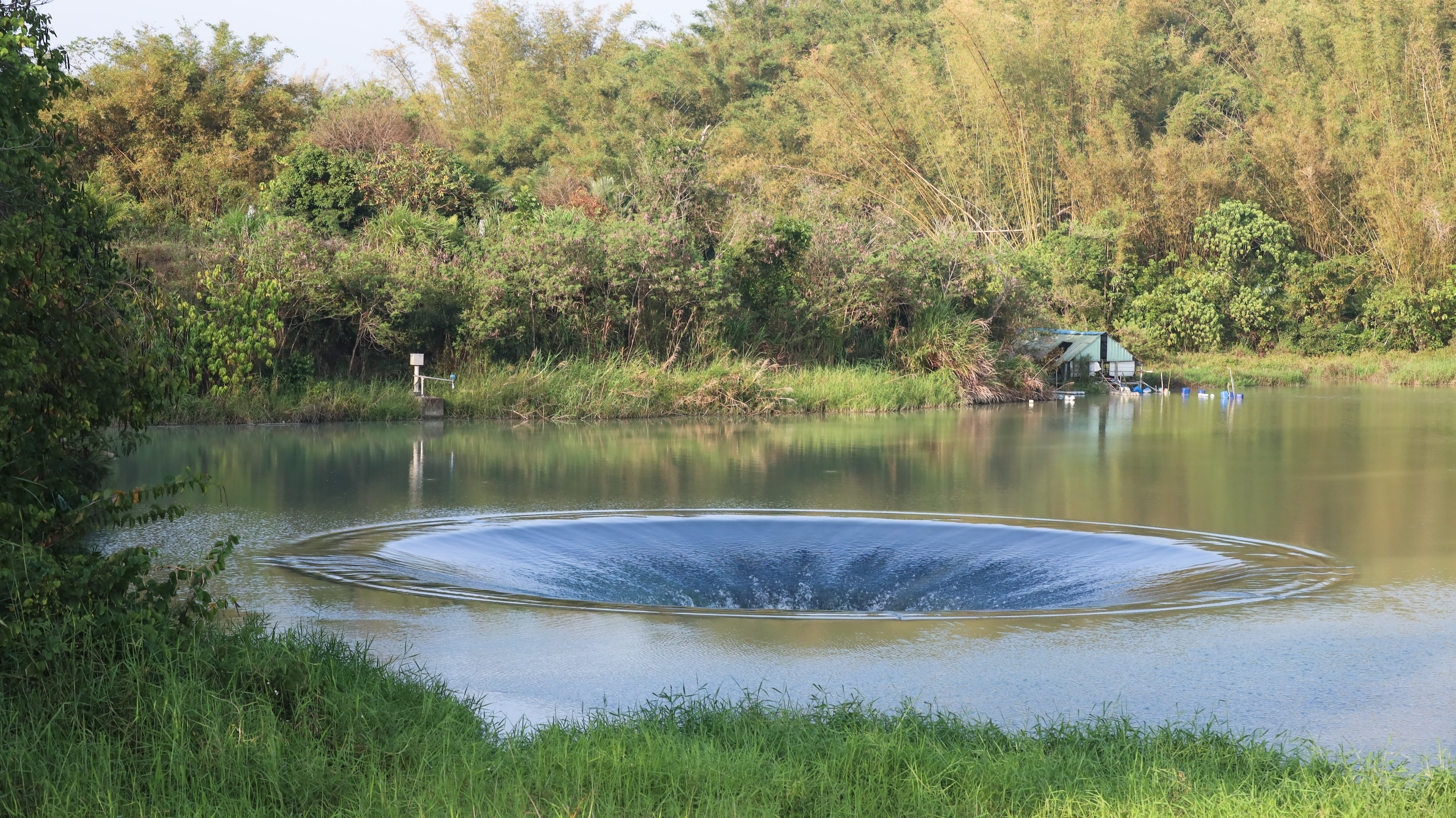 終於走到了西口小瑞士。其實在200m外,就可以清晰聽到西口豎井漩渦的水聲,現場的景象、水量和聲音,非常令人震撼且記憶猶存。「西口」指的是烏山嶺的西側引水口,是八田與一為預防珊瑚潭(烏山頭水庫)缺水,另外又開鑿一條長約 4km 的引水道,將烏山嶺東側的曾文溪引入西側的河道,因高低落差大,便於土壩中央建立垂直的引水通道,引水至下方的柚子坑溪,亦利用高低位能發電,巨大豎井的井口有著龐大的瞬間進水量,形成奇特天井漩渦奇觀。