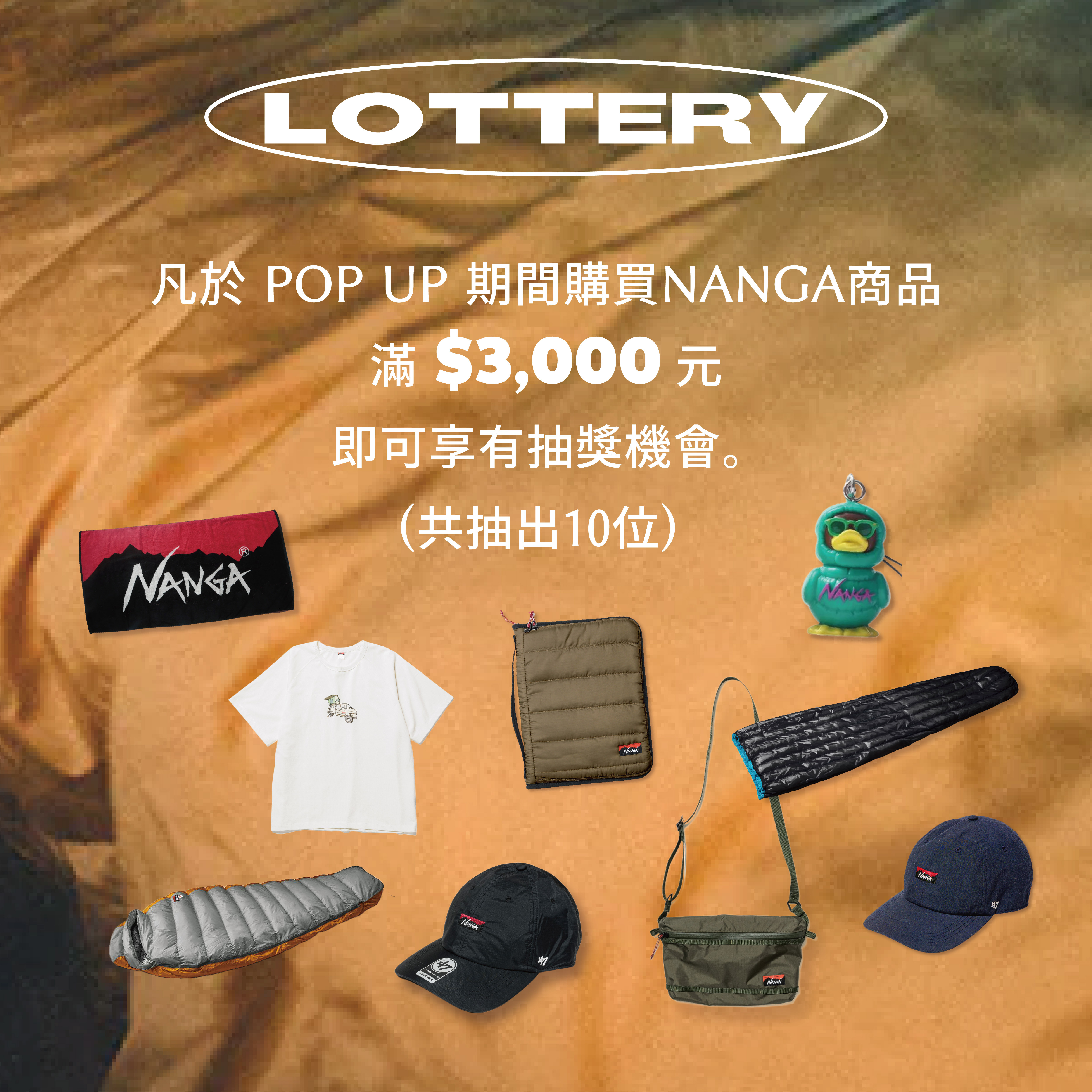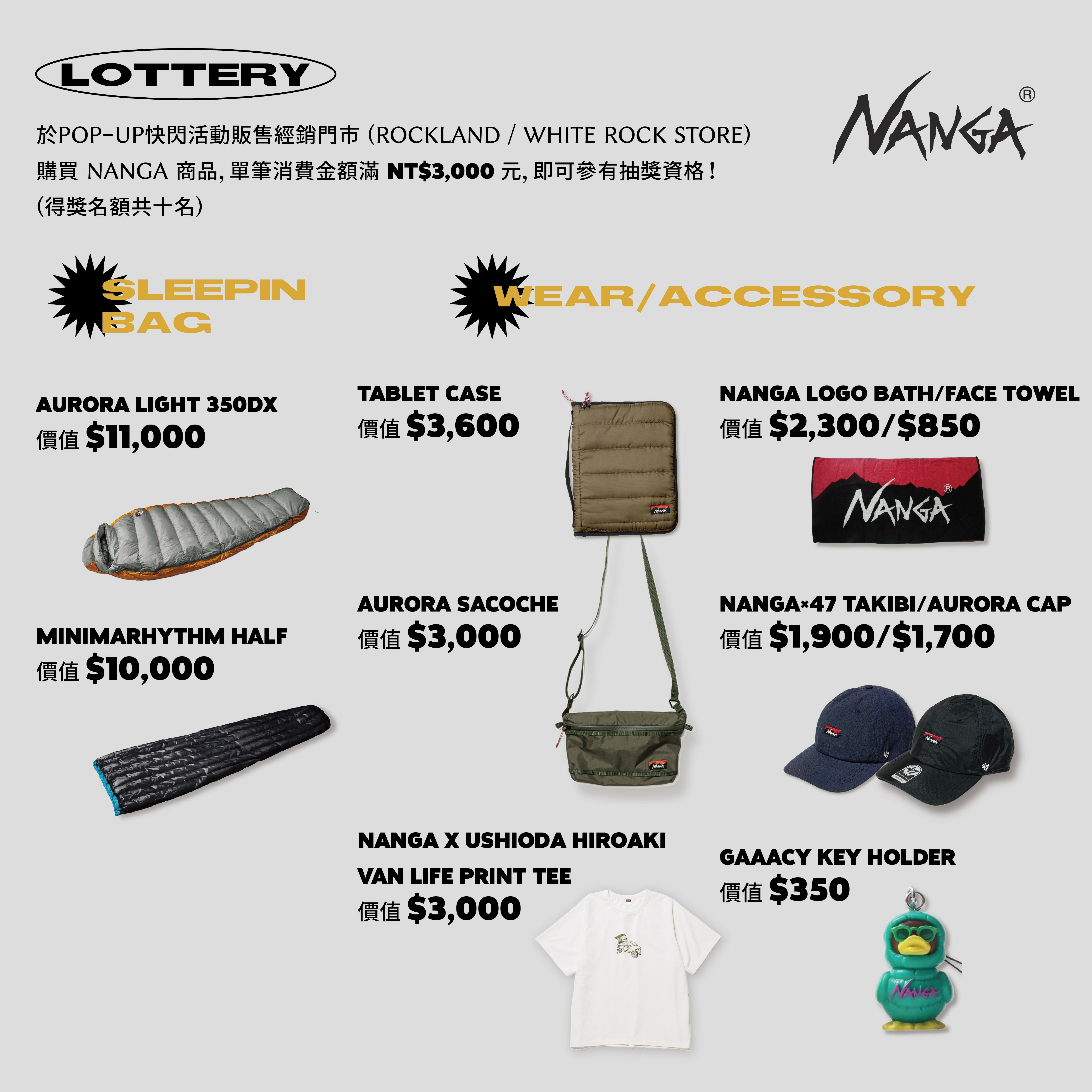 ▪ 於 POP-UP 快閃活動販售經銷門市 (ROCKLAND / WHITE ROCK STORE) 購買 NANGA 商品,單筆消費金額滿 𝗡𝗧$𝟯,𝟬𝟬𝟬 元,即可擁有抽獎資格!