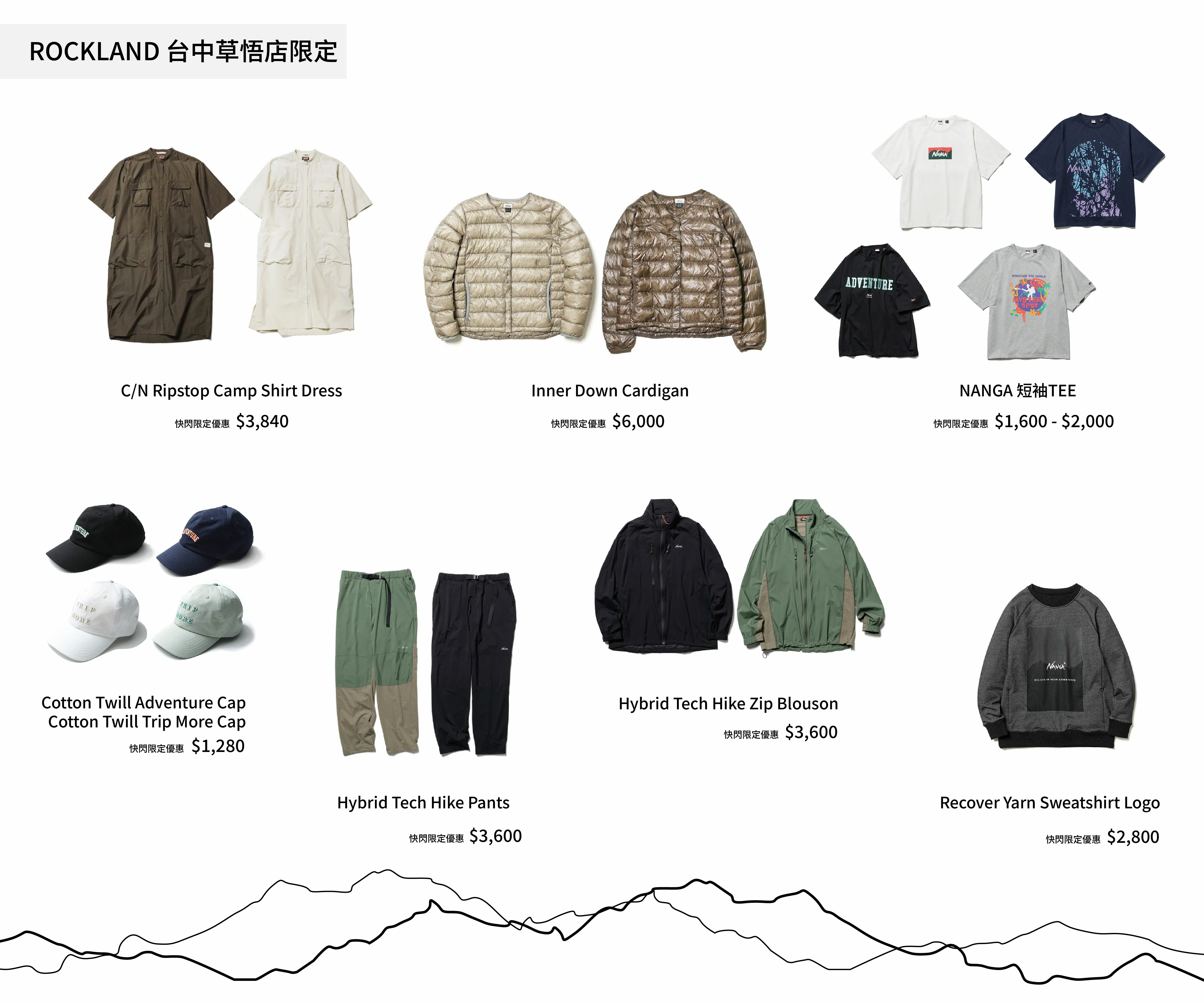 NANGA 的系列商品也將進駐 CAFE!N ⺠權店,包含多款經典商品「NANGA X 47 TAKIBI CAP 棒球帽」、「ECO HYBRID 永續系列上⾐」、「TAKIBI RIPSTOP 難燃抗撕裂機能單品」、 「GOOD SLEEPING 系列羽絨被」及⼈氣款配件商品,應有盡有!同時釋出快閃限定三款優惠商品「NYLON TUSSER 防⽔快乾短袖襯衫」、「ECO HYBRID 藝術插畫寬版Tee」、「經典可拆袖羽絨⾐」,於快閃期間即可享有⼋折優惠,機會難得絕不能錯過!