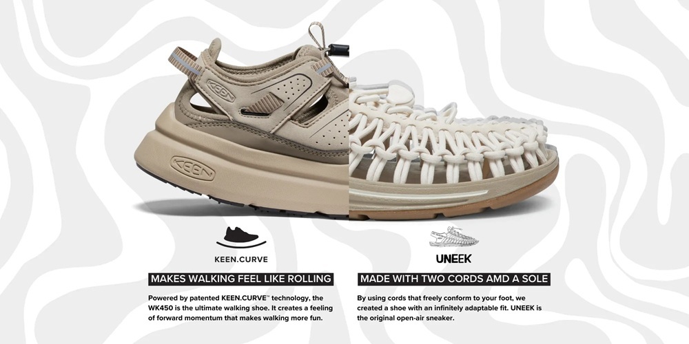 KEEN 經典 UNEEK 今年為系列家族增添全新風貌的成員 - UNEEK WK。以 UNEEK 的鞋繩編織特色,搭配近年品牌主打的 KEEN.CURVE 專利弧形鞋底,兼具時尚設計與功能性。