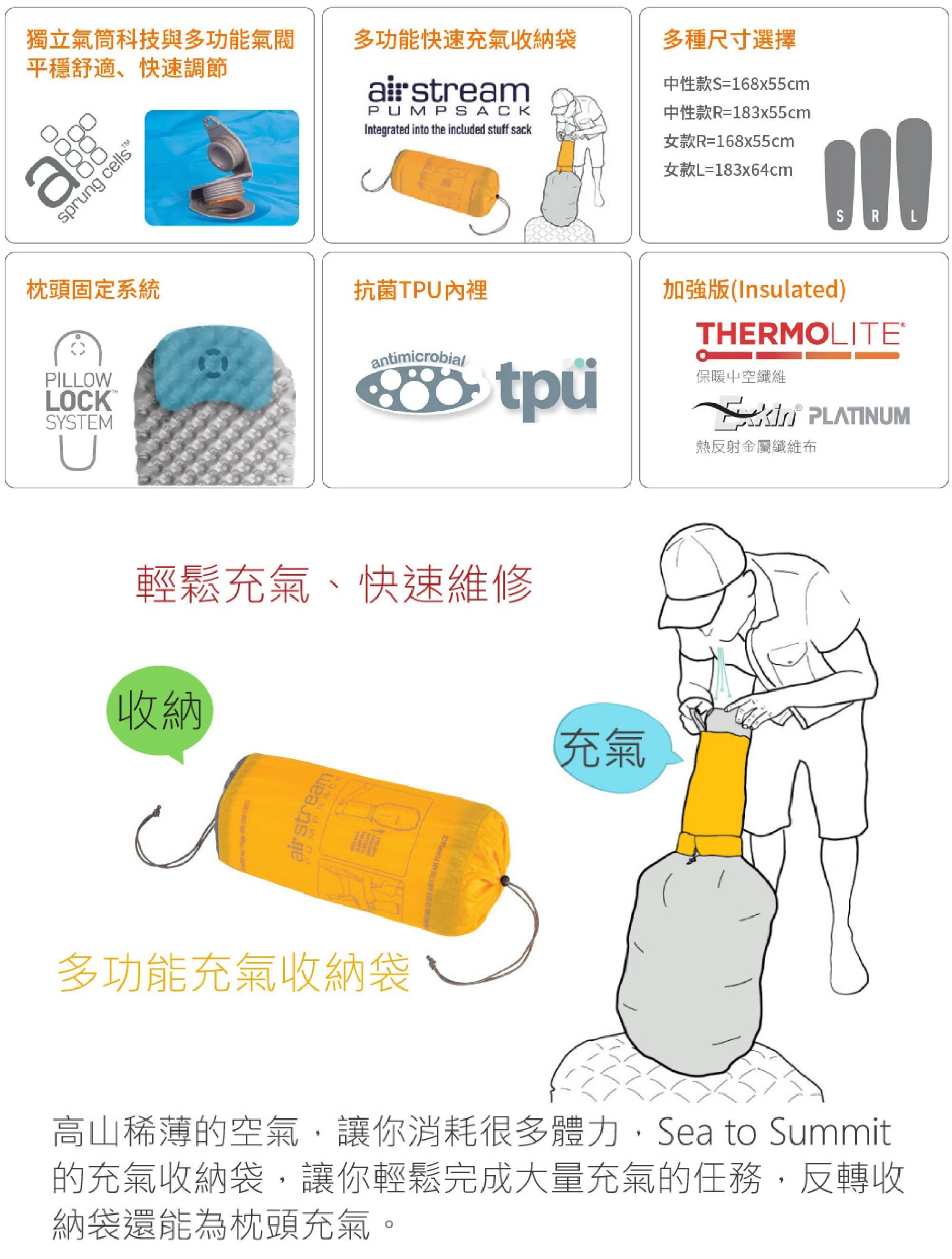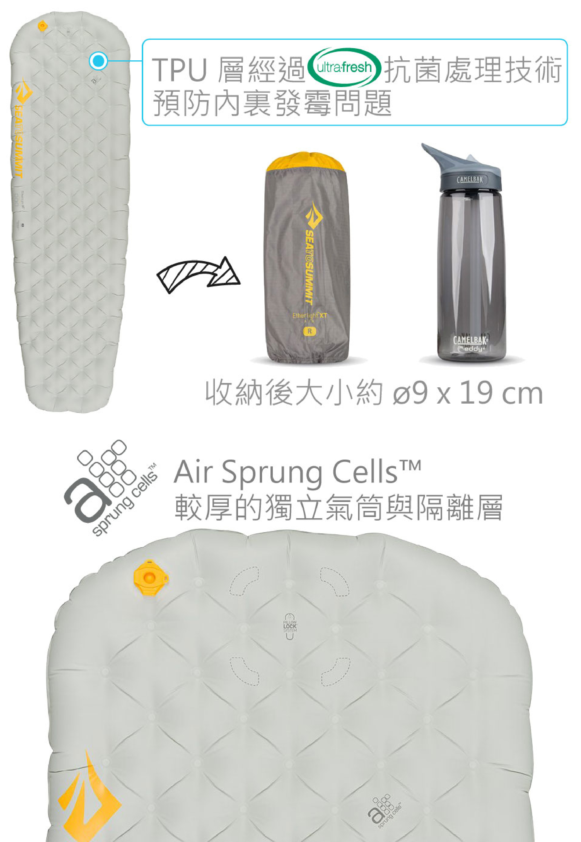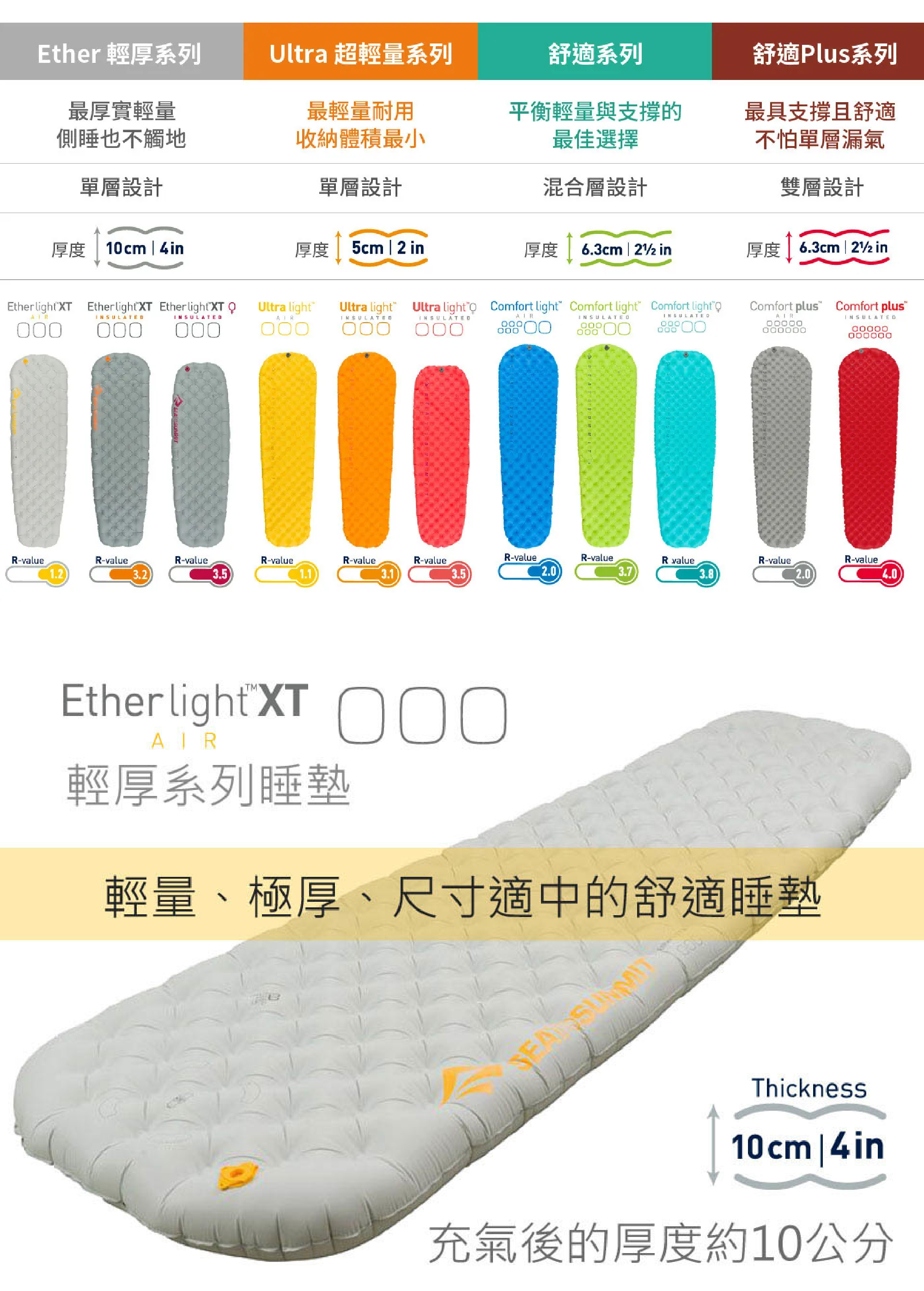 輕量、極厚、尺寸適中的輕量舒適睡墊,適合偏好側睡的人使用,較為厚實的睡墊高度,不因睡姿造成身體偏向單側,進而直接接觸地面的情況產生。使用 TPU 塗層製出較大的多個獨立環型氣室並與上下層的Air Sprung CellTM 獨立氣筒做連結。環狀氣室的設計將上下層距離拉大,能在用較少布料的情況下,製造出較大的隔離空間。